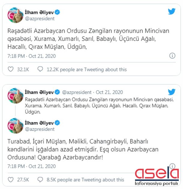 • Zəngilan rayonunun Mincivan qəsəbəsi və 13 kəndi - Xurama, Xumarlı, Sarıl, Babaylı, Üçüncü Ağalı, Hacallı, Qırax Müşlan, Üdgün, Turabad, İçəri Müşlan, Məlikli, Cahangirbəyli, Baharlı kəndləri işğaldan azad edilib. Bu barədə Prezident İlham Əliyev özünün rəsmi tviter səhifəsində məlumat verib.