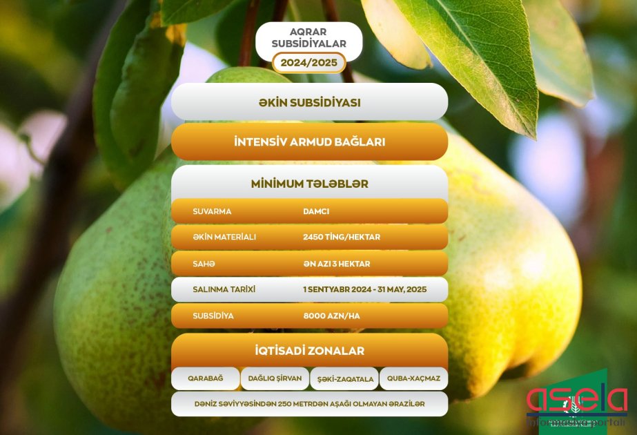 Kənd Təsərrüfatı Nazirliyinin İctimaiyyətlə əlaqələr və informasiya təminatı şöbəsindən bildirilib ki, Aqrar Subsidiya Şurasının qərarına əsasən, sentyabrın 1-dən 2025-ci il mayın 31-dək salınan armud bağlarının hər hektarına görə, fermerlərə 8000 manat əkin subsidiyası veriləcək.