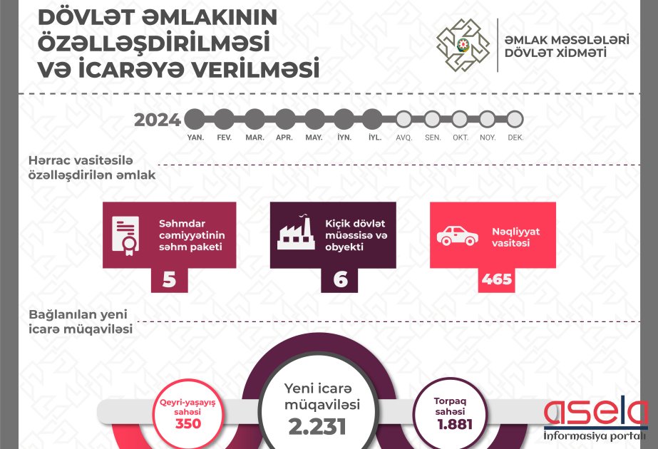 Əmlak Məsələləri Dövlət Xidməti tərəfindən cari ilin ilk 7 ayında özəlləşdirmə və icarədən dövlət büdcəsinə 122,8 milyon manat vəsaitin ödənilməsi təmin edilib. Dövlət əmlakının özəlləşdirilməsi və icarəyə verilməsi sahəsində işlər davam etdirilir.