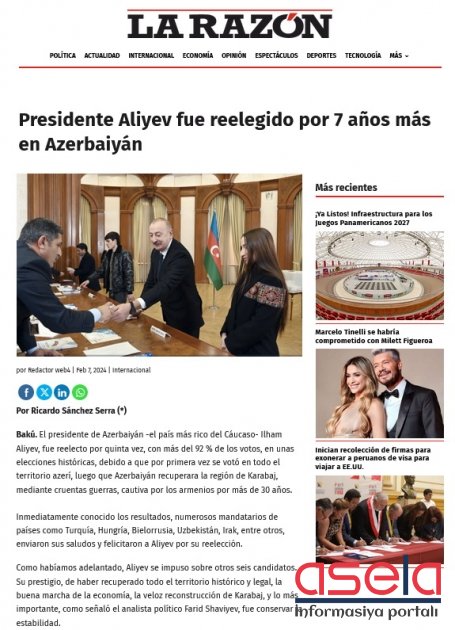 Peru Jurnalistlər Federasiyasının internet səhifəsində, həmçinin Perunun nüfuzlu mətbu orqanlarından olan “La Razon” xəbər portalında bu günlərdə Azərbaycanda səfərdə olan məşhur perulu jurnalist Rikardo Sançesin müəllifliyi ilə ölkəmizdə keçirilən növbədənkənar prezident seçkiləri barədə geniş məqalələr dərc olunub.