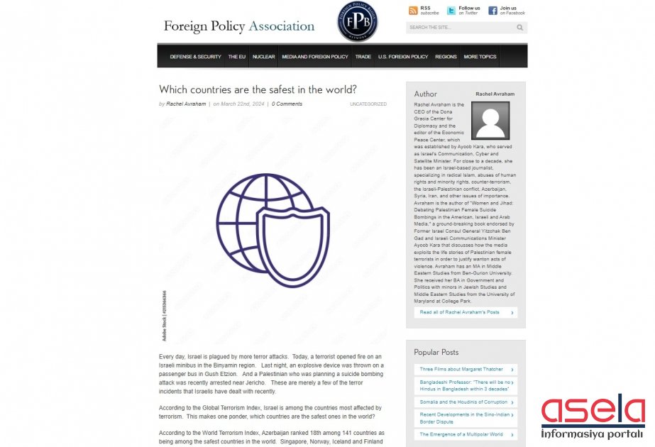 Baş qərargahı ABŞ-ın Nyu-York şəhərində yerləşən Xarici Siyasət Assosiasiyasının xəbər saytında "Dünyanın ən təhlükəsiz ölkələri hansılardır?" sərlövhəli məqalə dərc edilib.