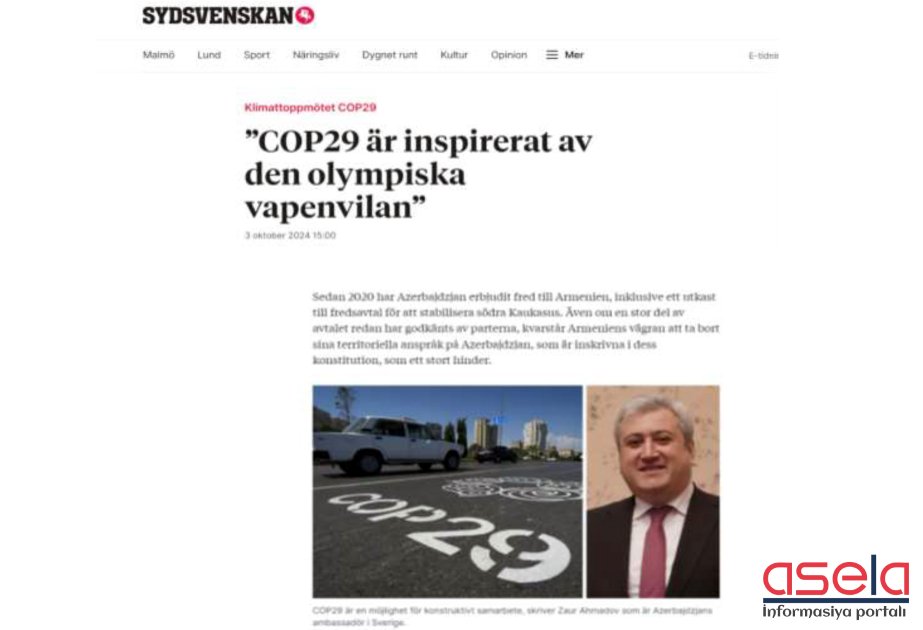 İsveçin “Sydsvenskan” qəzetində ermənipərəst dairələr tərəfindən BMT-nin İqlim Dəyişmələri üzrə Çərçivə Konvensiyasının Tərəflər Konfransının 29-cu sessiyasının (COP29) noyabrda Bakıda keçirilməsi ilə bağlı qərəzli yazılar dərc edilib.