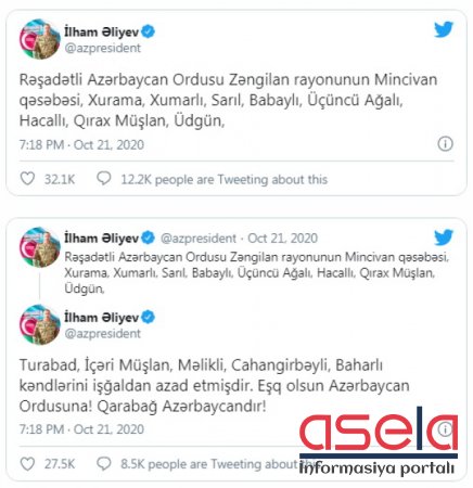 • BMT-nin Baş katibi Antonio Quterreş ilə Azərbaycan Prezidenti İlham Əliyev arasında videokonfrans formatında görüş olub. Prezident İlham Əliyev Ermənistanın Azərbaycana qarşı törətdiyi hərbi təxribatla bağlı hadisələrin gedişinə dair məlumat verib. Qeyd edib ki, sentyabrın 27-də Ermənistan təmas xətti boyunca Azərbaycan Silahlı Qüvvələrinin mövqelərini və yaşayış məntəqələrimizi ağır artilleriyadan atəşə tutub və bunun nəticəsində mülki şəxslərimiz və hərbi qulluqçularımız həlak olublar. Azərbaycan tərəfi özünümüdafiə məqsədilə uğurlu əks-hücum əməliyyatları həyata keçirir.