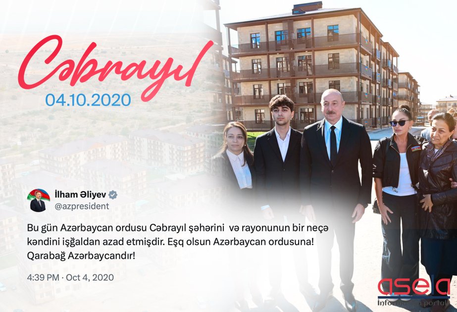 Bakı, 4 oktyabr. Azərbaycan Respublikasının Prezidenti İlham Əliyev rəsmi sosial şəbəkə səhifələrində Cəbrayıl şəhərinin işğaldan azad edilməsinin 5-ci ildönümü ilə bağlı paylaşım edib.