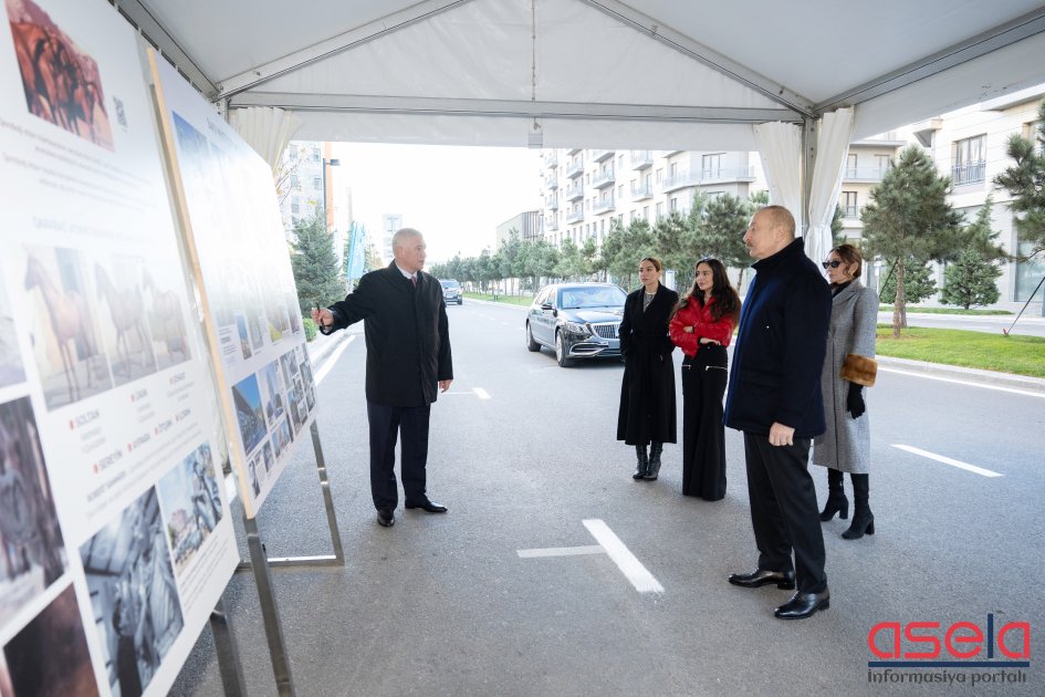 Prezident İlham Əliyev, birinci xanım Mehriban Əliyeva və qızları əvvəlcə “Qarabağ atları” heykəltaraşlıq kompleksi ilə tanış oldular. Vətən müharibəsindəki Qələbəmizə həsr edilmiş və milli irsimizin rəmzi olan bu kompleks “Qarabağ atları” meydanında ucaldılıb. Kompleksdə "Soltan", "Ürək", "Sereyin", "Aypara", "Şöhrət", "Ötqəm" və "İldırım" adlı ümumilikdə 7 Qarabağ atının heykəli var.