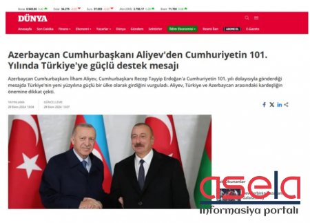 Türkiyə mediası Prezident İlham Əliyevin qardaş ölkənin Respublika Günü münasibətilə təbrikini geniş işıqlandırıb